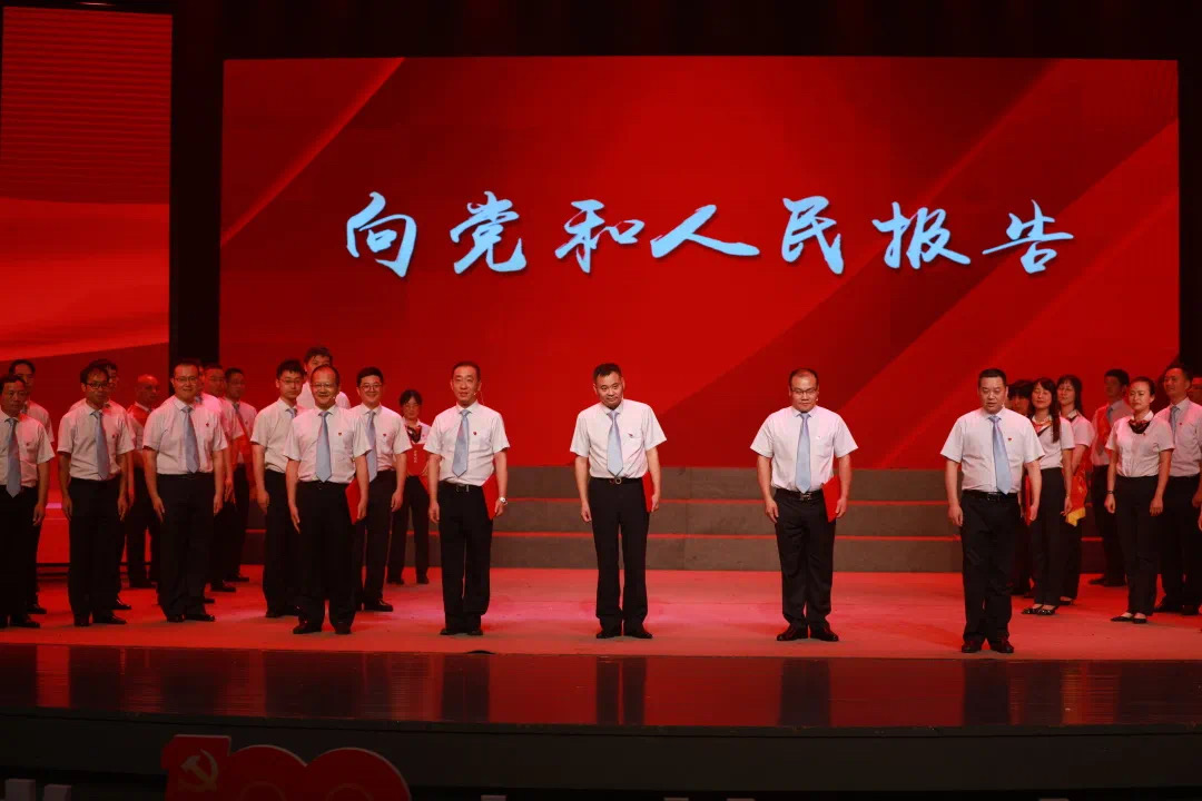 晚會在《向黨和人民報告》中進入高潮,集團黨委書記、董事長周儉,集團黨委副書記、副董事長、總經理朱志康分別為榮獲2020年集團先進基層黨組織、優秀黨務工作者和優秀共產黨員代表頒獎;現場,全體新黨員和老黨員在周儉董事長帶領下莊嚴宣誓,表達了身為新時代共產黨員的責任與擔當;集團下屬5家公司主要負責人向全體人員現場報告本公司“十四五”時期目標,表達了對黨、對政府、對人民的承諾。