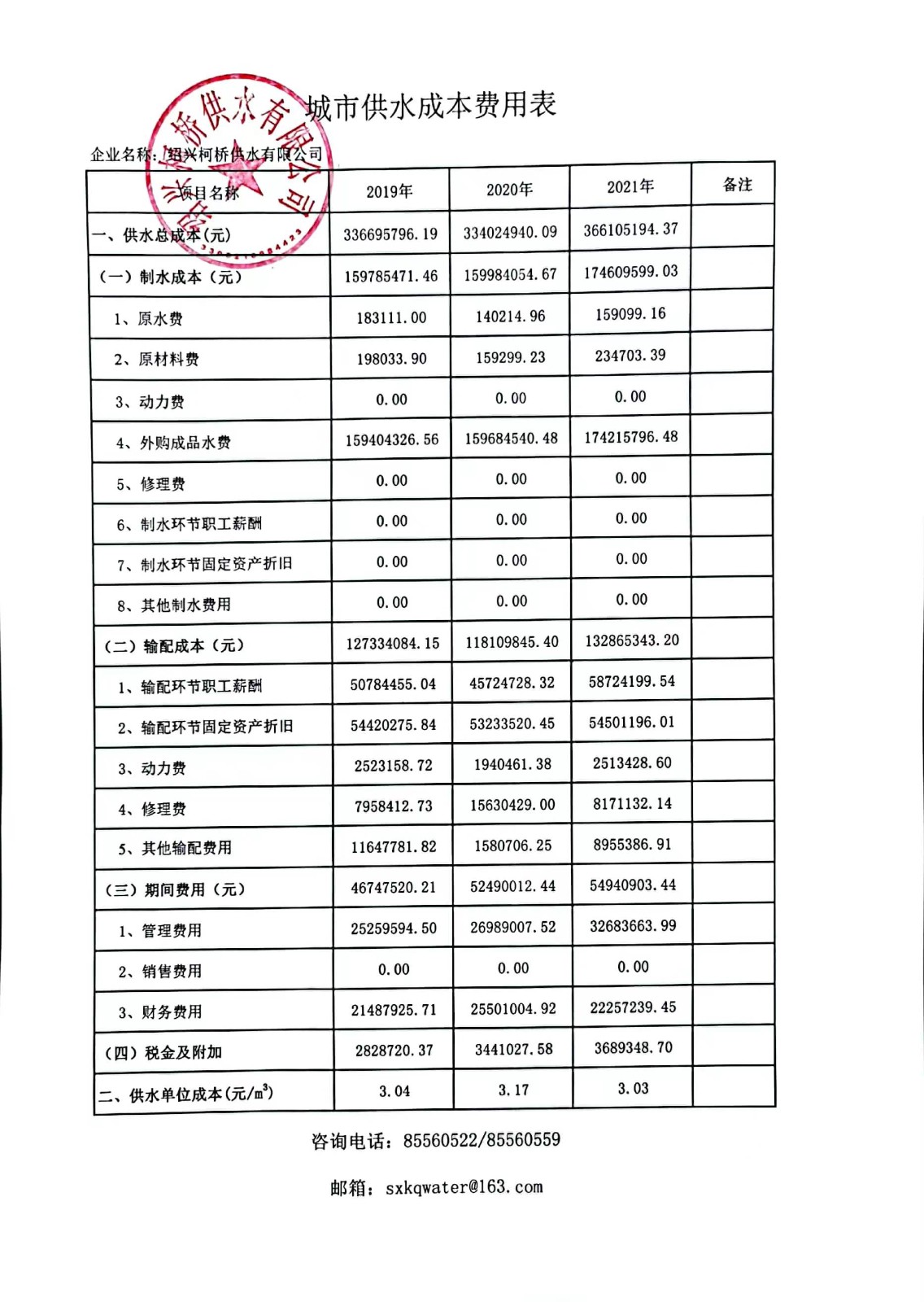 紹興柯橋供水有限公司供水成本信息公示