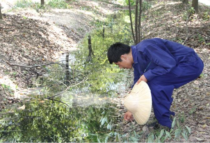 10:50,在81#標志樁附近的小樹林里,溝里的水有些發(fā)黑,王師傅仔細查找根源,確定是旁邊的染料廢桶堆積場里流出來的廢水。