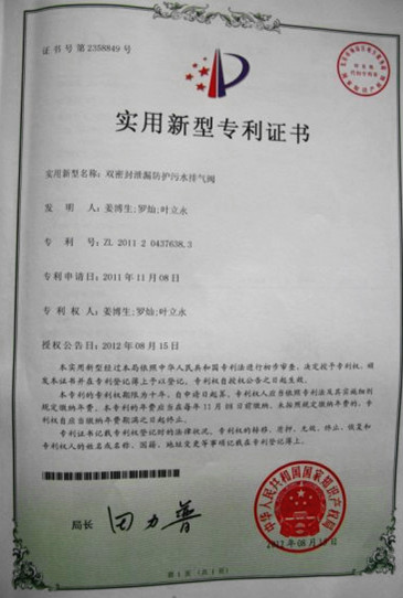 日前,集團(tuán)“雙密封泄漏防護(hù)污水排氣閥”專(zhuān)利項(xiàng)目得到國(guó)家知識(shí)產(chǎn)權(quán)局正式批復(fù),獲實(shí)用新型專(zhuān)利授權(quán)。