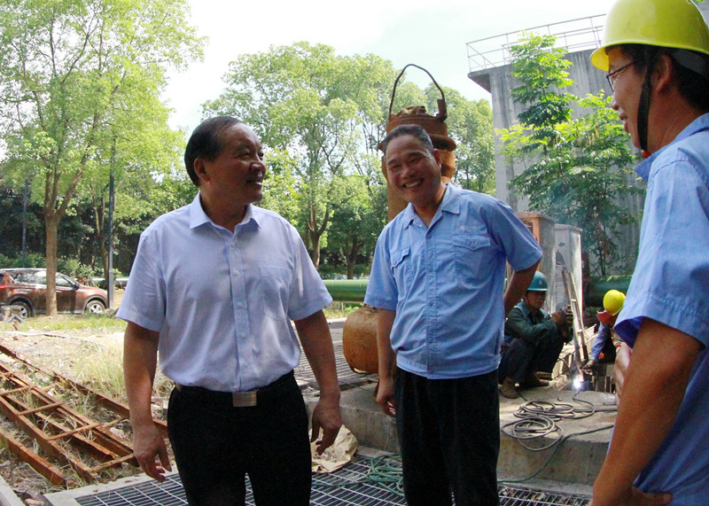 圖為集團副總經理張則再在江濱水處理公司一體化生化池機修現場慰問運行工人