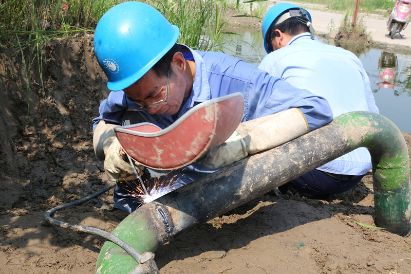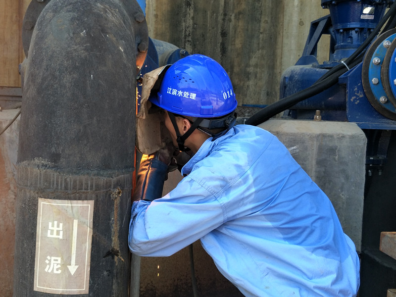 江濱水處理公司設備部作業人員正對排泥管道進行搶修焊接作業,焊接時火花四濺,溫度可以達到140℃左右。