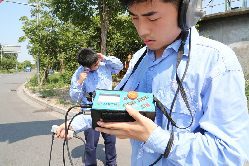 濱海供水公司檢漏員頂著烈日一路聽漏。