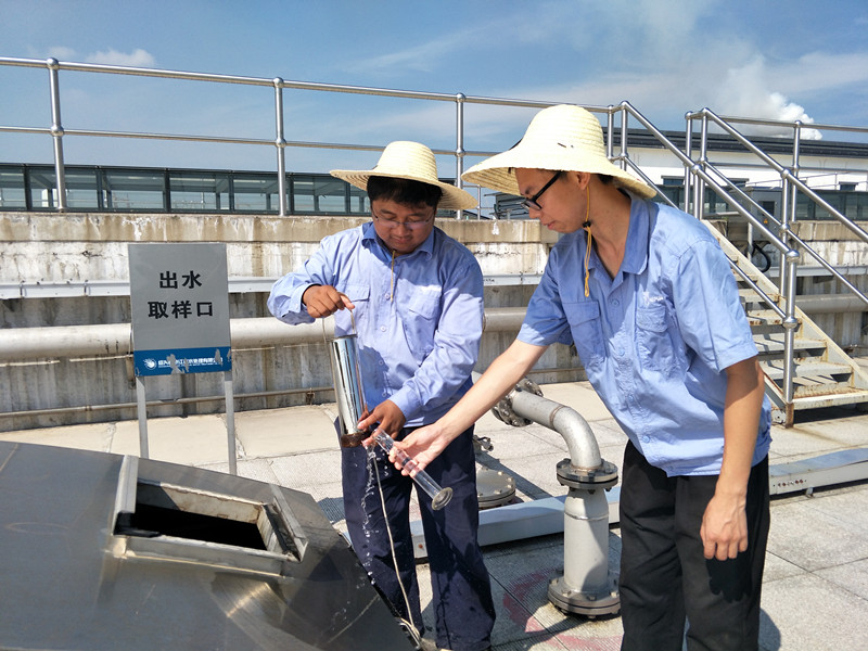 江濱水處理公司數米高的污水池上面,運行二部的兩名職工頂著烈日取樣。