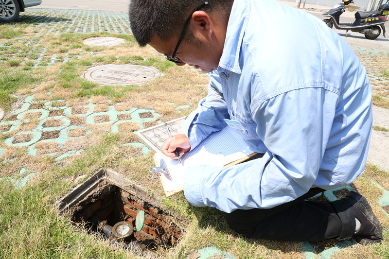 在室外火辣的太陽下,濱海供水公司抄表員一次次地抬起表蓋,記錄數據。