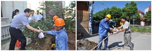 7月17日上午,集團公司黨委副書記、紀委書記高小林、副總經理王嘉賢在公司領導的陪同下,到城區唯美品格紫薇園和紫郡花園工地現場慰問供水一線職工,送上防暑慰問品,并叮囑大家在高溫酷暑下作業要注意做好防暑措施。