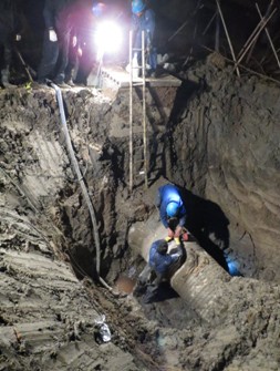11月23日,濱海北側(cè)泵站DN500進(jìn)水管多處斷裂,導(dǎo)致濱海興濱路華納藥業(yè)門口的綠化帶上出現(xiàn)了一條長50米,寬3米深1米的溝壑,情況十分危險(xiǎn)。維修分公司立即組織人員趕赴現(xiàn)場(chǎng)勘察,面對(duì)路面濕滑結(jié)冰;高壓電線、水管光纜錯(cuò)綜復(fù)雜;管道破損區(qū)域廣、埋藏深度深等困難,維修員們?cè)绯鐾須w,每天工作12小時(shí),歷時(shí)17天,修復(fù)管道一百三十余米,終于在12月8日,順利完成濱海興濱路DN500管搶修工作。