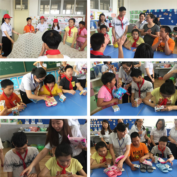 在學校老師的帶領下,“愛心媽媽”和黨員志愿者們陪伴特殊孩子們一起參與躲鯊魚、網布傳球和擊鼓傳花等互動游戲,并為孩子們送去了住校用的拖鞋、毛巾等物資,用愛心給孩子們帶去歡笑,給予他們溫暖與關懷。