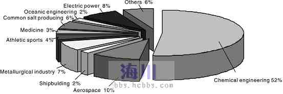 化工系統是中國民用工業最早使用鈦, 且用量最大的工業部門。近10年,我國化工行業用鈦量相當于2009年和2010年兩年鈦材生產量之和。表列出了我國化工各領域用鈦的比例