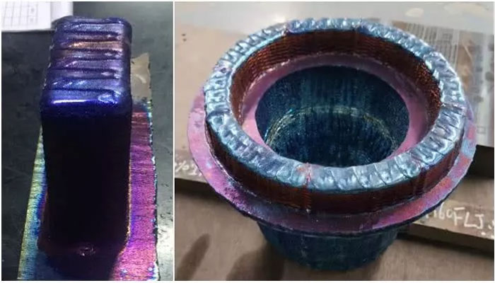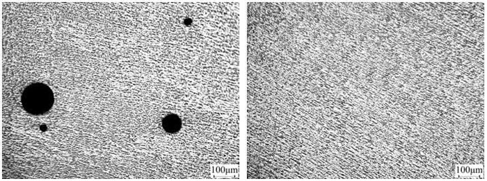 高溫鈦合金激光沉積成形組織形貌(左圖:優(yōu)化前 右圖:優(yōu)化后)