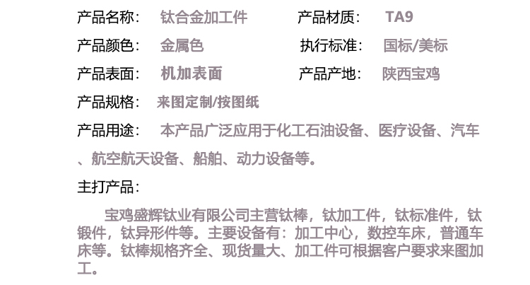 寶雞盛輝鈦業有限公司主營鈦棒,鈦加工件,鈦標準件,鈦鍛件,鈦異