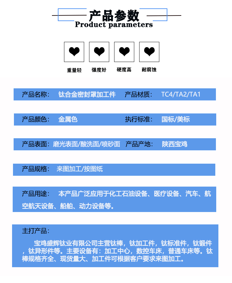 寶雞盛輝鈦業有限公司是一家主要從事鈦及鈦合金棒,鈦環,鈦法蘭及鈦合金板材的高新技術企業,公司提供鈦環,鈦合金棒批發,鈦環的生產工藝服務,以人為本,質量取勝為宗旨:18791863990,18740375975
