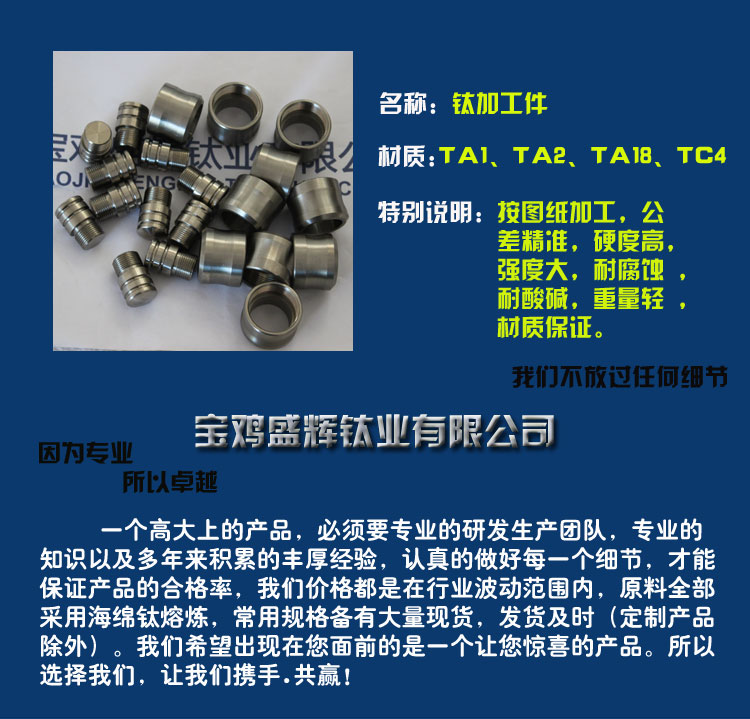 寶雞盛輝鈦業有限公司是一家主要從事鈦及鈦合金棒,鈦環,鈦法蘭及鈦合金板材的高新技術企業,公司提供鈦環,鈦合金棒批發,鈦環的生產工藝服務,以人為本,質量取勝為宗旨:18791863990,18740375975