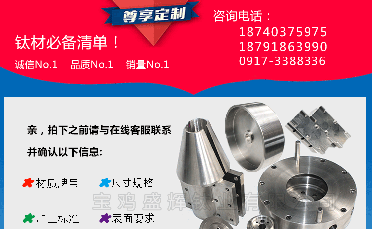 寶雞盛輝鈦業專業生產銷售各種規格的鈦棒,鈦加工件,各類鈦標準件,鈦鍛件,鈦異形件等。主要設備有:加工中