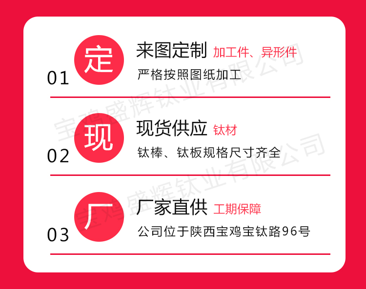 對每一位客戶——我們都詳細地了解和分析不同需要,在提供方案的同時從產品兼容性、可擴展性及技術支持等方面進行充分的考慮,以針對客戶的需要提供優秀的方案。“用戶至上”是我們一貫的宗旨。嚴格而行之有效的售前、售后服務,是寶雞盛輝盛輝鈦業信心的保證。