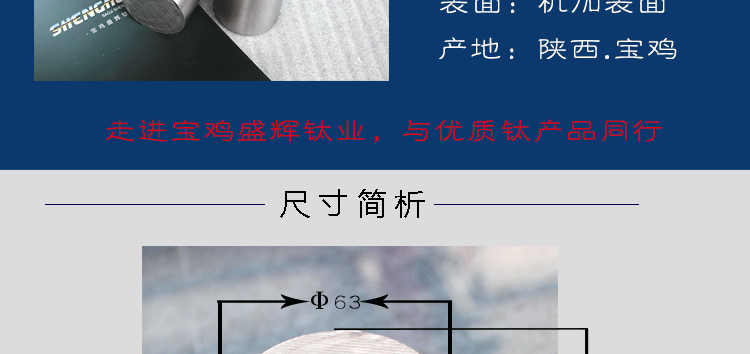 寶雞盛輝鈦業專業生產銷售各種規格的鈦棒,鈦加工件,各類鈦標準件,鈦鍛件,鈦異形件等。主要設備有:加工中心,數控車床,普通車床等。設備齊全,生產能力強,可根據