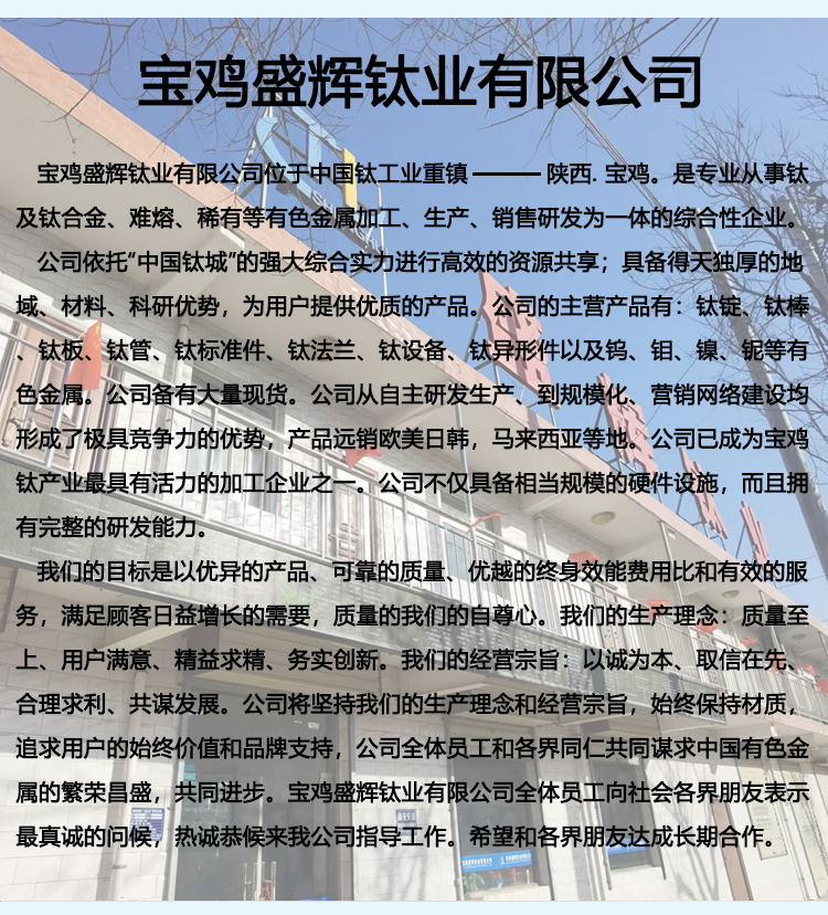 寶雞盛輝鈦業(yè)有限公司是一家主要從事鈦及鈦合金棒,鈦環(huán),鈦法蘭及鈦合金板材的高新技術(shù)企業(yè),公司提供鈦環(huán),鈦合金棒批發(fā),鈦環(huán)的生產(chǎn)工藝服務(wù),以人為本,質(zhì)量取勝為宗旨:18791863990,18740375975